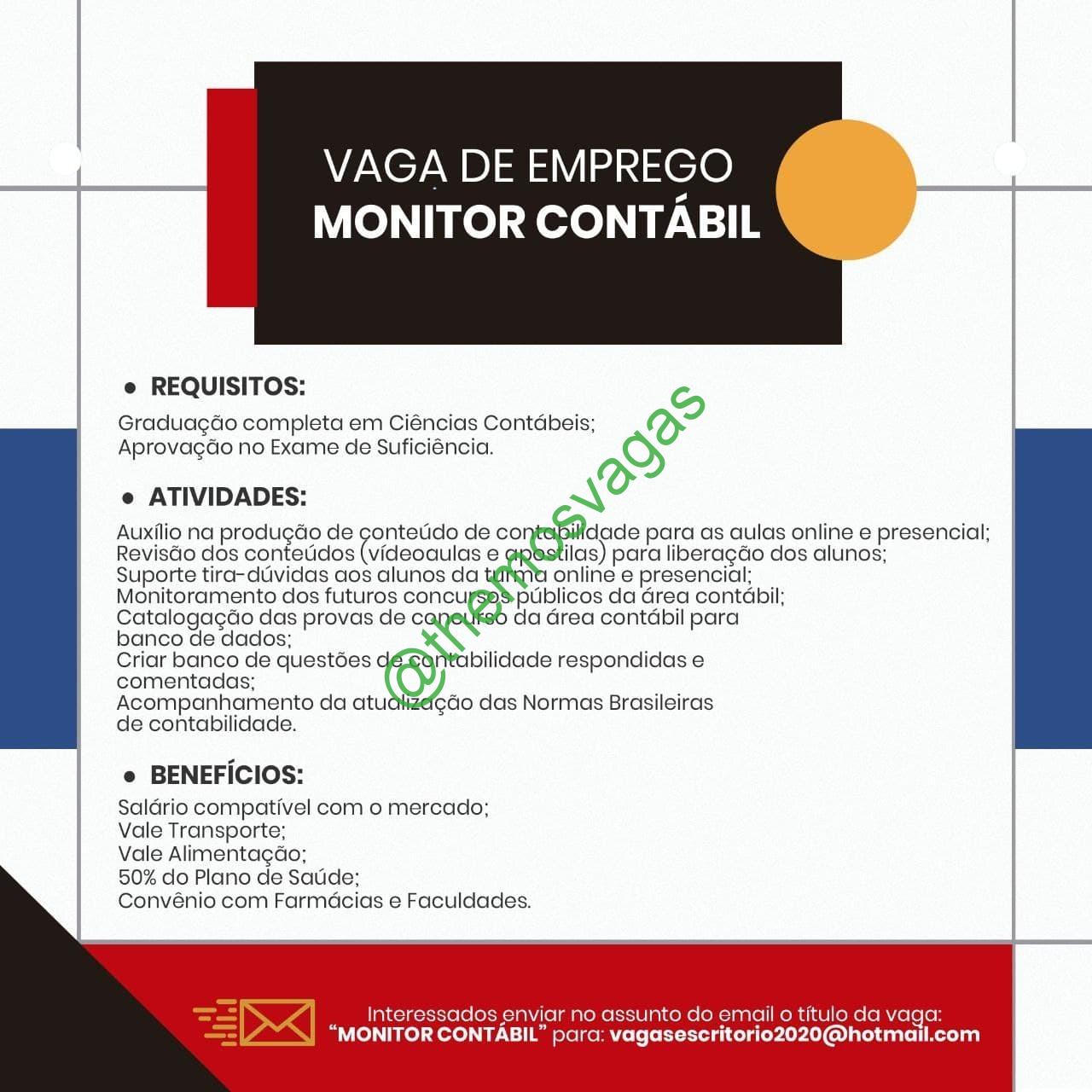 – Interessados(as) e que atendam ao perfil solicitado acima, devem enviar o currículo até  para e-mail vagasescritorio2020@hotmail.com contendo no titulo/assunto “Monitor Contábil – FOR