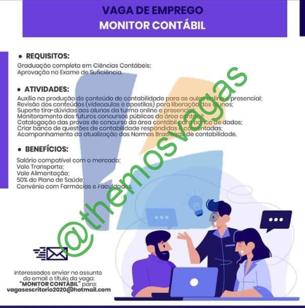 – Interessados(as) e que atendam ao perfil solicitado acima, devem enviar o currículo para o e-mail vagasescritorio2020@hotmail.com, contendo no título/assunto “Monitor Contábil – FOR