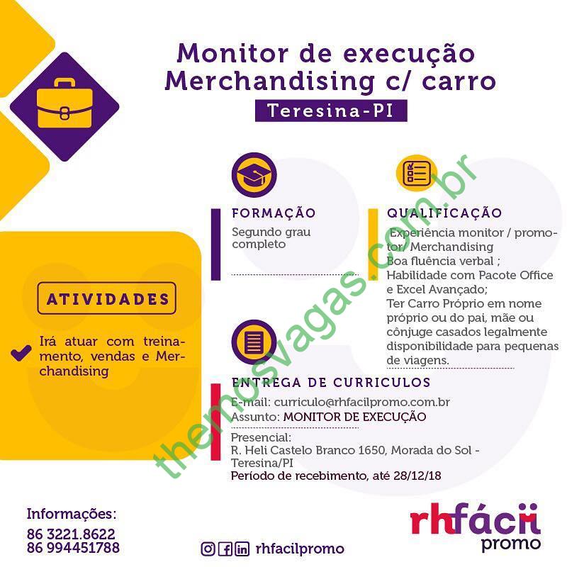 Interessados(as) e que atendam aos requisitos exigidos acima devem enviar o perfil profissional até 28/12/2018, contendo no título/assunto do e-mail “Monitor de Execução Merchandising com Carro”, para curriculo@rhfacilpromo.com.br ou entregar presencialmente na Rua Heli Castelo Branco 1650, Morada do Sol – Teresina/PI . Mais informações através do número: (86) 3221.8622 ou 86 994451788.