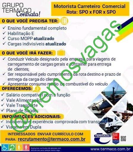 – Interessados(as) e que atendam ao perfil solicitado acima, devem enviar o currículo para o e-mail recrutamento@termaco.com.br, contendo no titulo/assunto “Motorista Carreteiro Comercial – FOR”