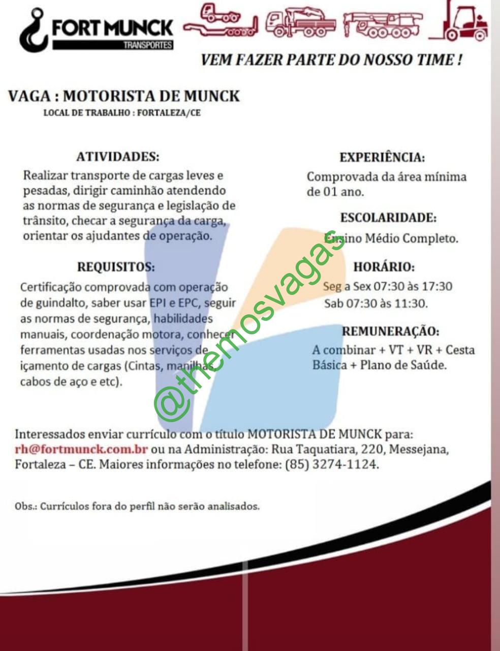 – Interessados(as) e que atendam ao perfil solicitado acima, devem enviar o currículo para o e-mail rh@fortmunk.com.br, contendo no título/assunto “Motorista de Munk – FOR”.