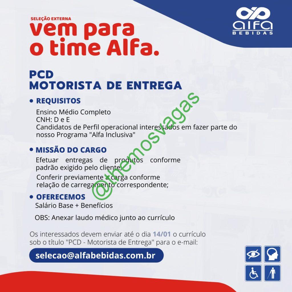 – Interessados(as) e que atendam ao perfil solicitado acima, devem enviar o currículo até 14/01/2022  para o e-mail selecao@alfabebidas.com.br contendo no título/assunto “PCD – Motorista de Entrega