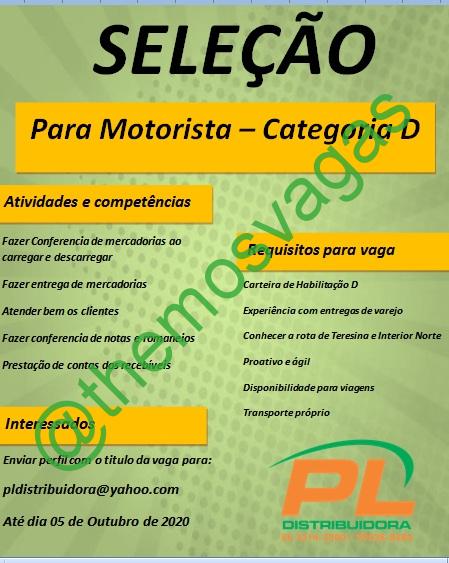 – Interessados(as) e que atendam ao perfil solicitado acima, devem enviar o currículo até 05/10/2020 para o e-mail pldistribuidora@yahoo.com contendo no título/assunto “Motorista THE