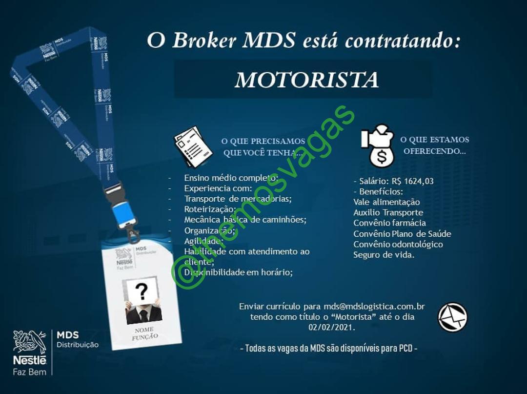 – Interessados(as) e que atendam ao perfil solicitado acima, devem enviar o currículo até 02/02/2021 para o e-mail mds@mdslogistica.com.br contendo no título/assunto “Motorista THE