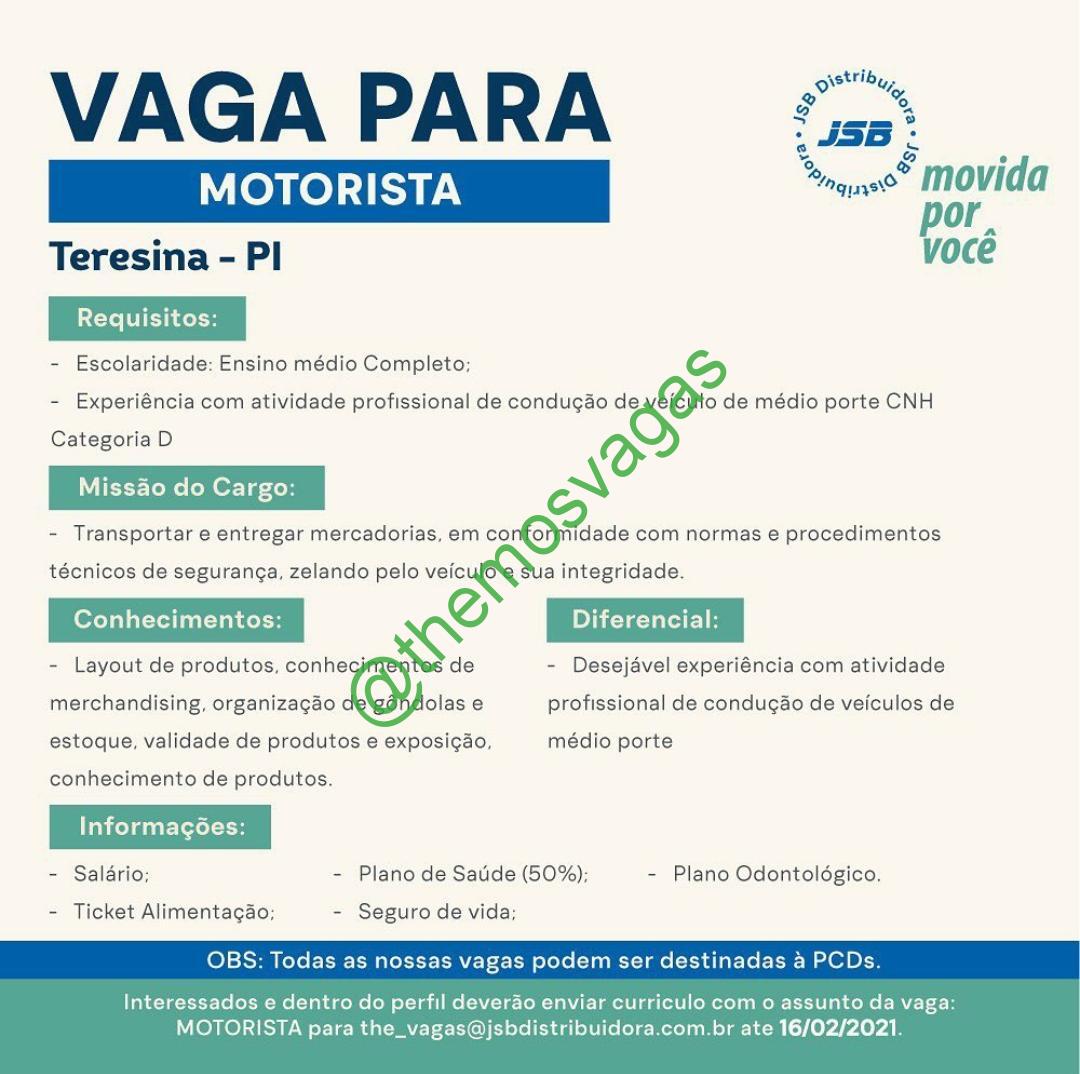 – Interessados(as) e que atendam ao perfil solicitado acima, devem enviar o currículo até 16/02/2021 para o e-mail the_vagas@jsbdistribuidora.com.br , contendo no título/assunto “Motorista – THE“.