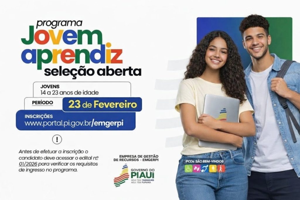 A Empresa de Gestão de Recursos do Estado do Piauí (Emgerpi) abriu processo seletivo para formação de cadastro de reserva do Programa Jovem Aprendiz. As inscrições serão realizadas exclusivamente on-line, nesta segunda-feira (23), das 0h às 23h59, pelo endereço https://portal.pi.gov.br/emgerpi. Podem participar jovens com idade mínima de 14 anos completos até o fim das inscrições e idade inferior a 23 anos na data da assinatura do contrato.