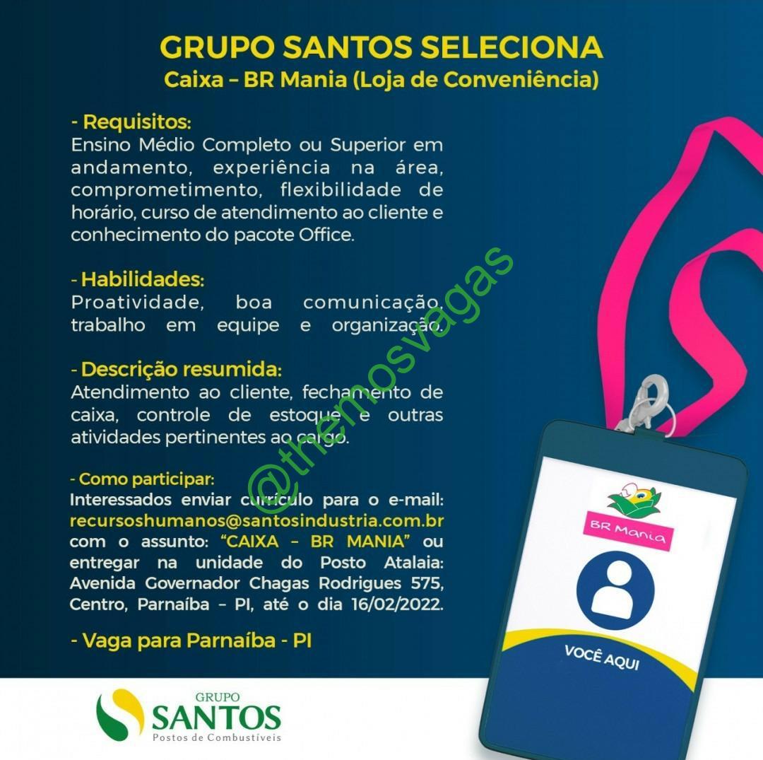 – Interessados(as) e que atendam ao perfil solicitado acima, devem enviar o currículo até 16/02/2022 para o e-mail recursoshumanos@santosindustria.com.br, contendo no título/assunto “Caixa – PHB“ ou entregar na unidade do posto atalaia: Av. Governador Chagas Rodrigues, 575, Centro, Parnaíba – PI.