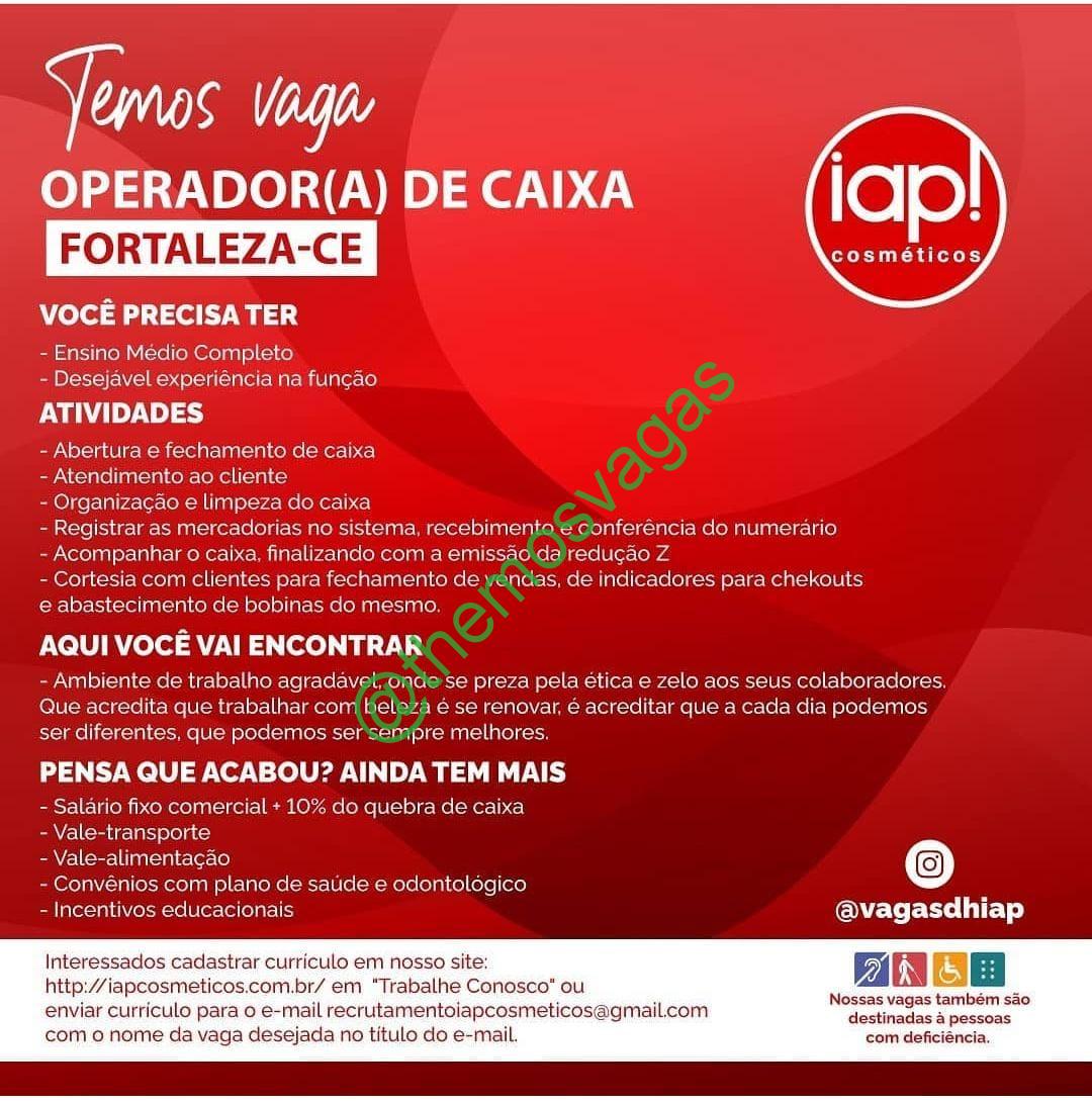 – Interessados(as) e que atendam ao perfil solicitado acima, devem enviar o currículo para o e-mail recrutamentoiapcosmeticos@gmail.com, contendo no titulo/assunto “Operador de Caixa – FOR”.  ou cadastrar o currículo na plataforma de cadastro site.