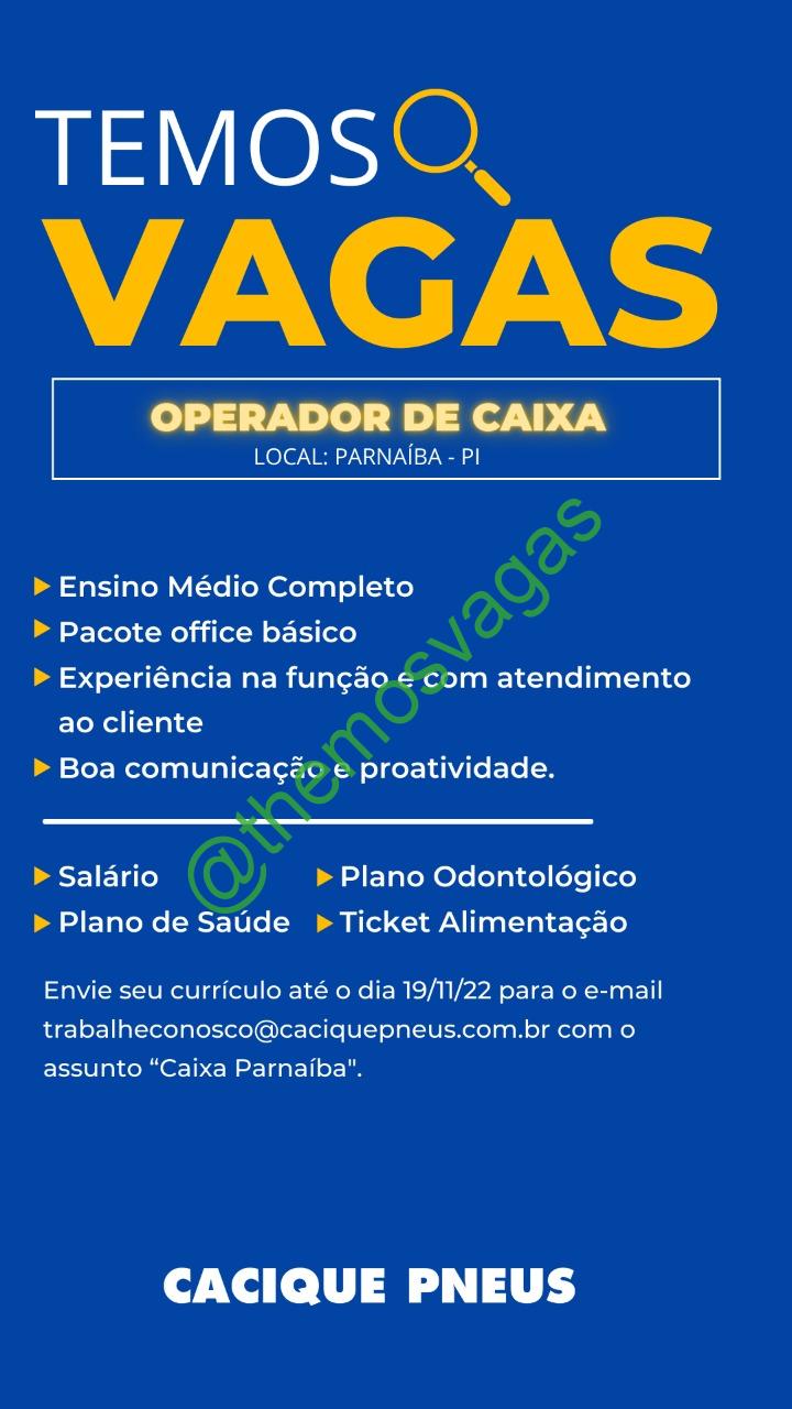 – Interessados(as) e que atendam ao perfil solicitado acima, devem enviar o currículo até 19/11/2022  para o e-mail trabalheconosco@caciquepneus.com.br contendo no título/assunto “Caixa Parnaíba