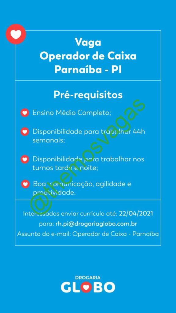 – Interessados(as) e que atendam ao perfil solicitado acima, devem enviar o currículo até 22/04/2021 para o e-mail rh.pi@drogariaglobo.com.br contendo no título/assunto “Operador de Caixa Parnaíba