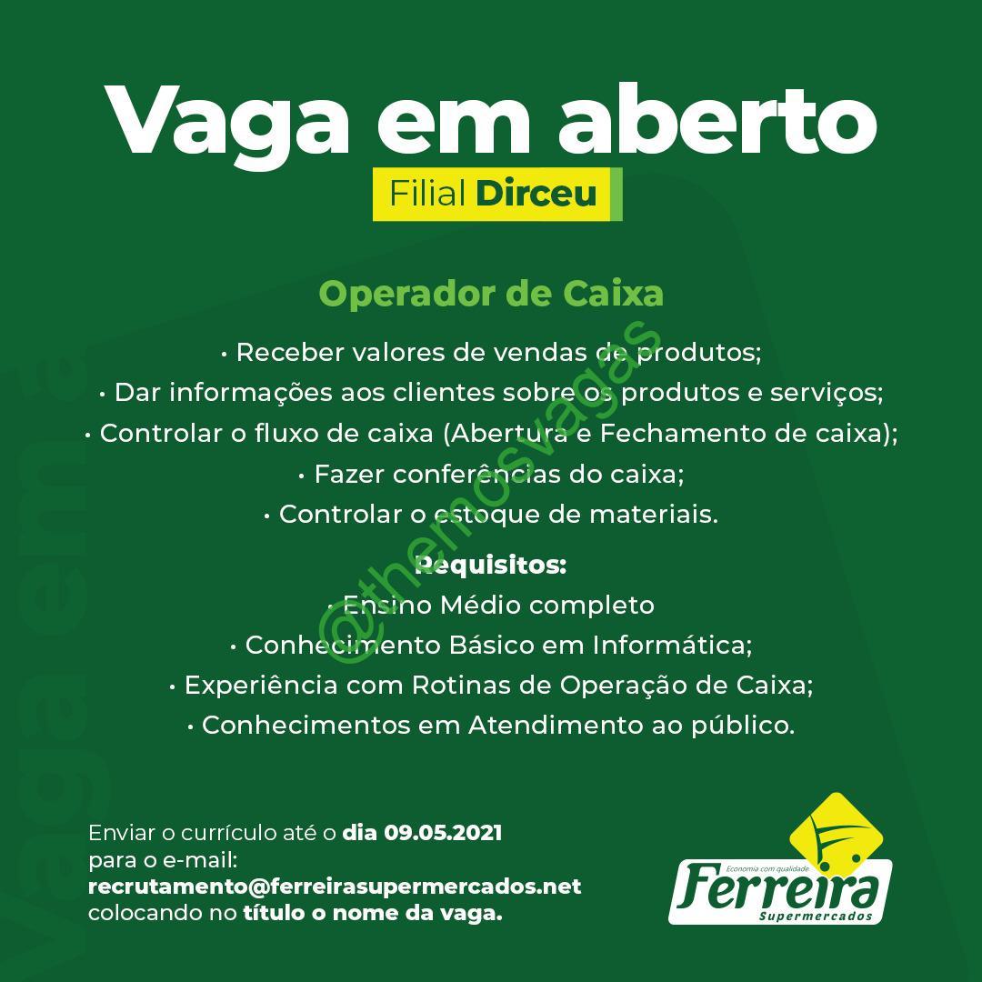 – Interessados(as) e que atendam ao perfil solicitado acima, devem enviar o currículo até 09/05/2021 para o e-mail recrutamento@ferreirasupermercados.net contendo no título/assunto “Operador de Caixa THE