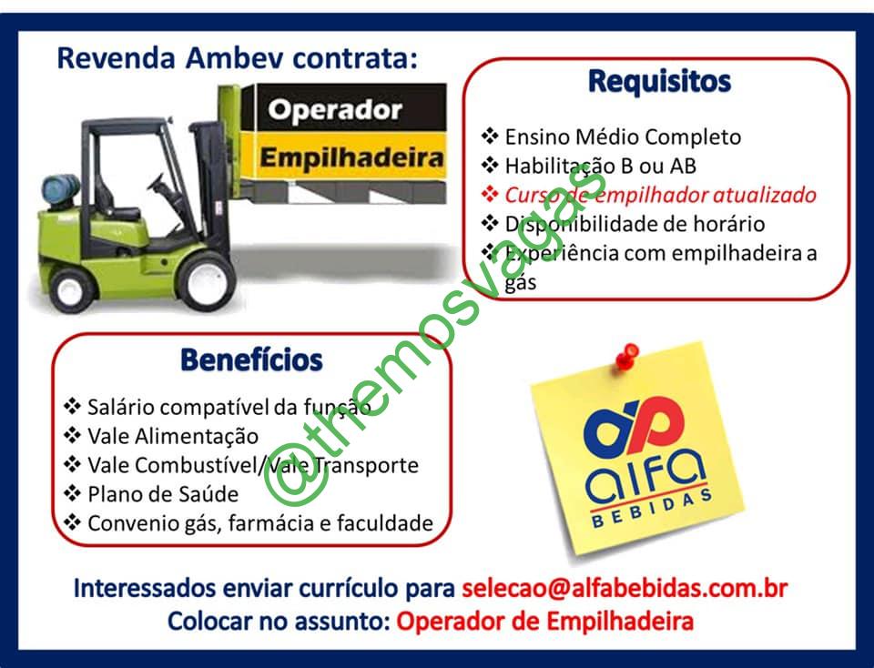 – Interessados(as) e que atendam ao perfil solicitado acima, devem enviar o currículo para o e-mail selecao@alfabebidas.com.br contendo no título/assunto “Operador de Empilhadeira“.