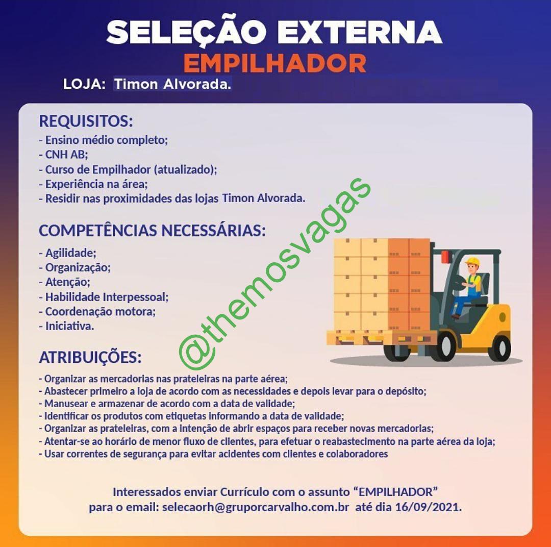 – Interessados(as) e que atendam ao perfil solicitado acima, devem enviar o currículo até 16/09/2021 para o e-mail selecaorh@gruporcarvalho.com.br , contendo no título/assunto “Empilhador“.