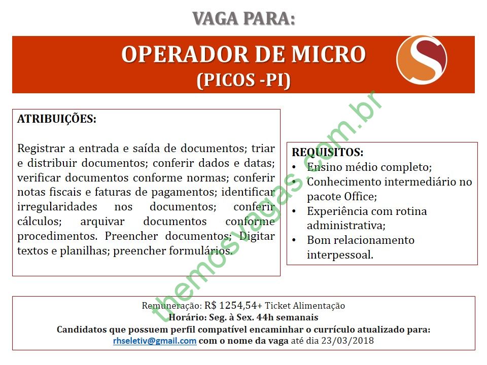 Interessados(as) e que atendam aos requisitos devem enviar o perfil profissional até o dia 23/03/2019, colocando no título do e-mail “Operador de Micro”, para: rhseletiv@gmail.com