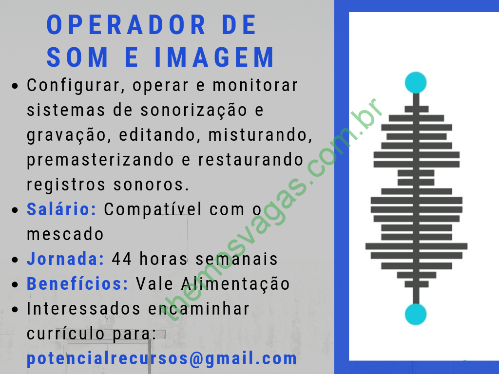 Interessados(as) e que atendam aos requisitos devem enviar o perfil profissional até o dia 19/02/2019, colocando no título do e-mail “Operador de Som e Imagem “, para: potencialrecursos@gmail.com (e-mail corrigido)