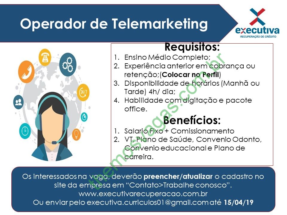 – Interessados(as) e que atendam aos requisitos devem enviar o perfil profissional até o dia 15/04/2019 para o e-mail: executiva.curriculos01@gmail.com