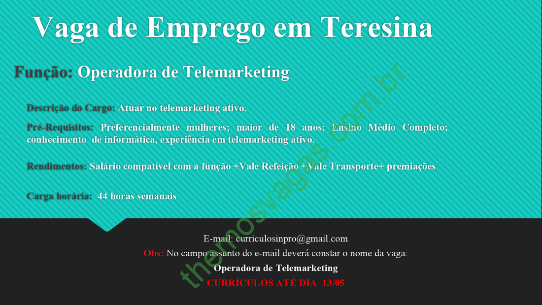 – Interessados(as) e que atendam aos requisitos devem enviar o perfil profissional até o dia 13/05/2019, colocando no título do e-mail “Operador de Telemarketing”, para: curriculosinpro@gmail.com