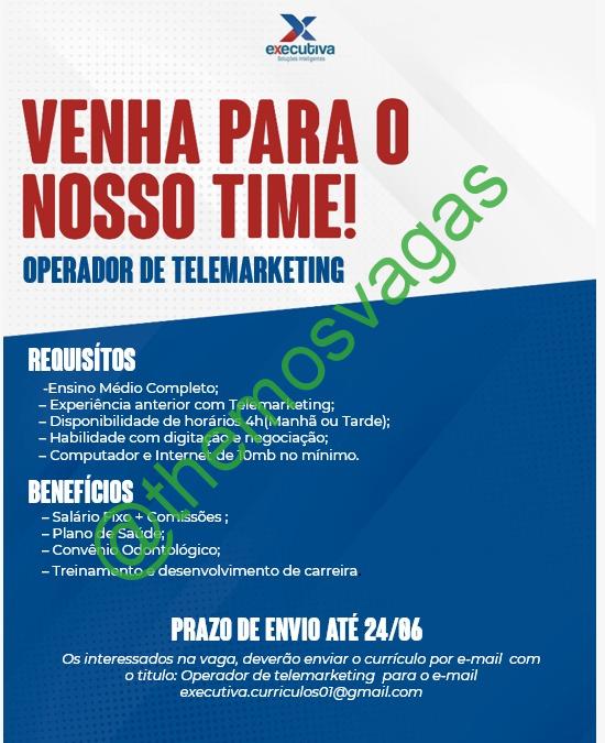 – Interessados(as) e que atendam ao perfil solicitado acima, devem enviar o currículo até 24/06/2021 para o e-mail executiva.curriculos01@gmail.com contendo no título/assunto “Operador de Telemarketing THE