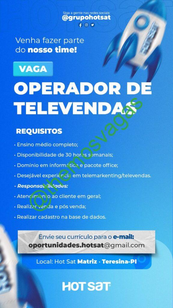 – Interessados(as) e que atendam ao perfil solicitado acima, devem enviar o currículo para o e-mail oportunidades.hotsat@gmail.com contendo no título/assunto “Operador de telemarketing