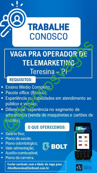 – Interessados(as) e que atendam ao perfil solicitado acima, devem enviar o currículo para o e-mail rhboltteresina@boltcard.com.br contendo no título/assunto “Operador de Telemarketing THE