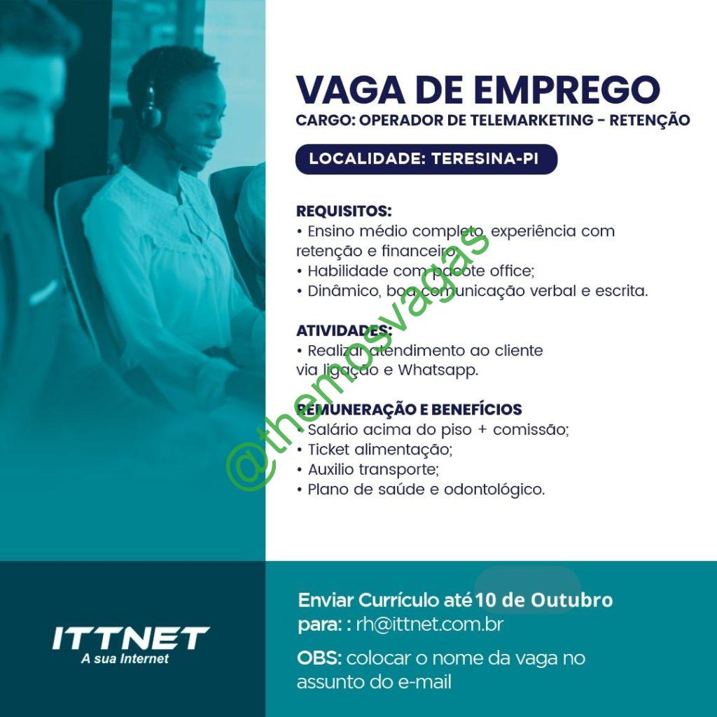 – Interessados(as) e que atendam ao perfil solicitado acima, devem enviar o currículo até 07/10/2022 para o e-mail rh@ittnet.com.br contendo no título/assunto “Operador de Telemarketing THE