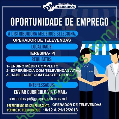 Interessados(as) e que atendam aos requisitos devem enviar o perfil profissional até o dia 21/12/2018, colocando no título do e-mail “Operador de Televendas”, para: curriculos.pi@grupomedeiros.net