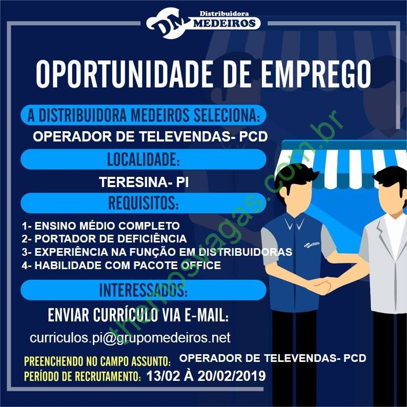 Interessados(as) e que atendam aos requisitos devem enviar o perfil profissional até o dia 20/02/2019, colocando no título do e-mail “Operador de Televendas PCD”, para: pi@grupomedeiros.net