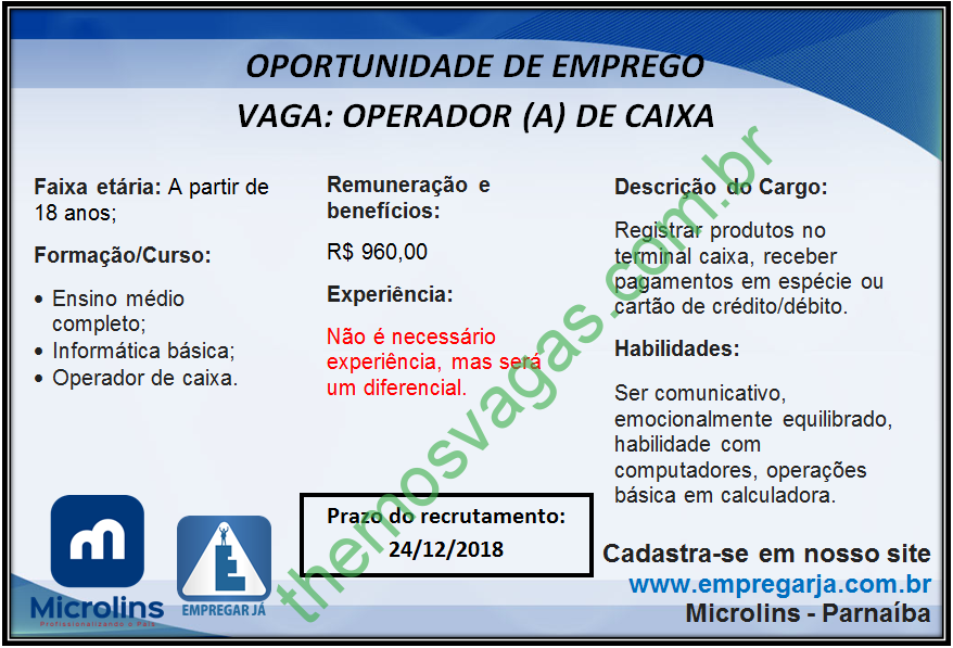 ---------- ATENÇÃO: Essa vaga é de responsabilidade do anunciante. Fique atento para possíveis golpes. Se perceber algo suspeito, nos comunique através do e-mail floromauel@gmail.com colocando no título "Themos Vagas - Denúncia" juntamente com o link da publicação e o motivo da denúncia na descrição da mensagem para que possamos analisar e parar de divulgar o anúncio. ----------