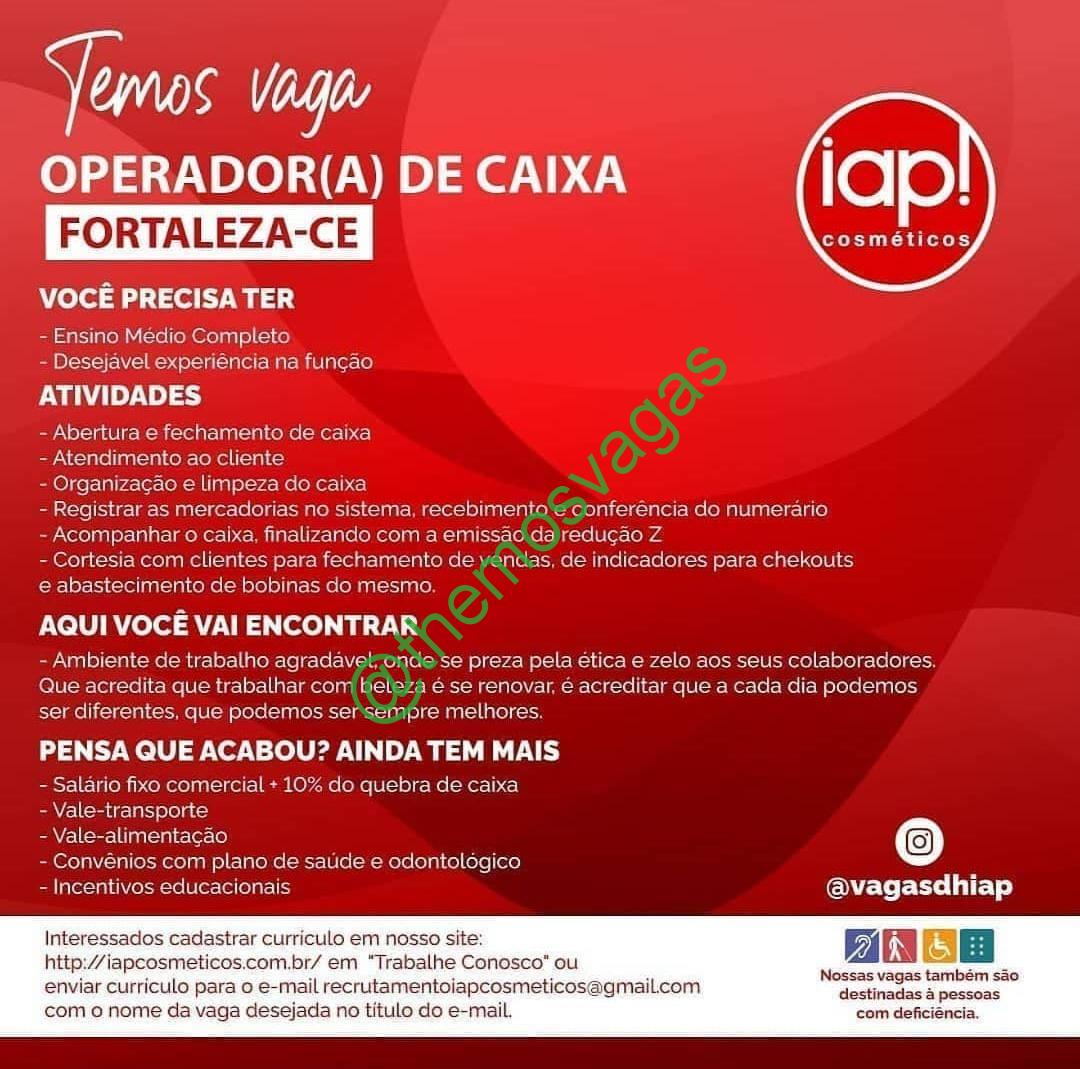 – Interessados(as) e que atendam ao perfil solicitado acima, devem enviar o currículo para o e-mail recrutamentoiapcosmeticos@gmail.com, contendo no titulo/assunto “Operador(a) de Caixa – FOR