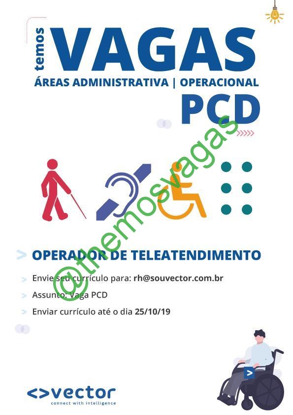 – Interessados(as) e que atendam ao perfil solicitado acima, devem enviar o currículo para o e-mail rh@souvector.com.br até o dia 25/10/2019 , colocando no título “Operador(a) de Teleatendimento PCD”.