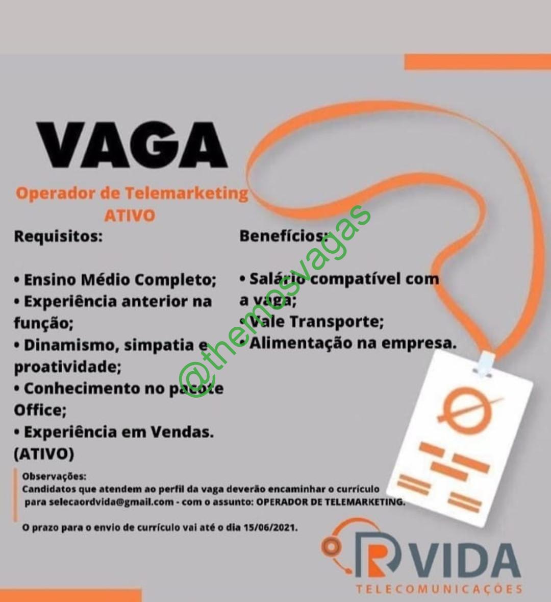 – Interessados(as) e que atendam ao perfil solicitado acima, devem enviar o currículo até 15|06|2021 para o e-mail selecaordvida@gmail.com, contendo no titulo/assunto “Operador(a) de Telemarketing – FOR