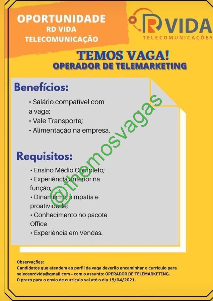 – Interessados(as) e que atendam ao perfil solicitado acima, devem enviar até o dia 15|04|2021 o currículo para o e-mail selecaordvida@gmail.com, contendo no título/assunto “OPERADOR DE TELEMARKETING – FOR”.