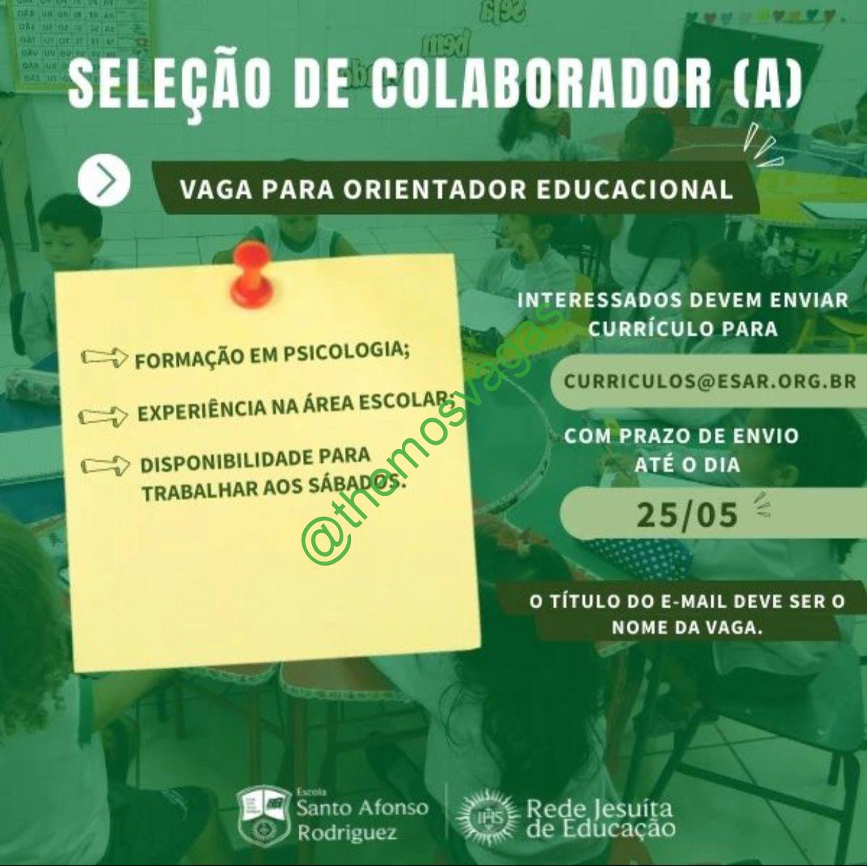 – Interessados(as) e que atendam ao perfil solicitado acima, devem enviar o currículo até 25/05/2022  para o e-mail curriculos@esar.org.br contendo no título/assunto “Orientador Educacional THE