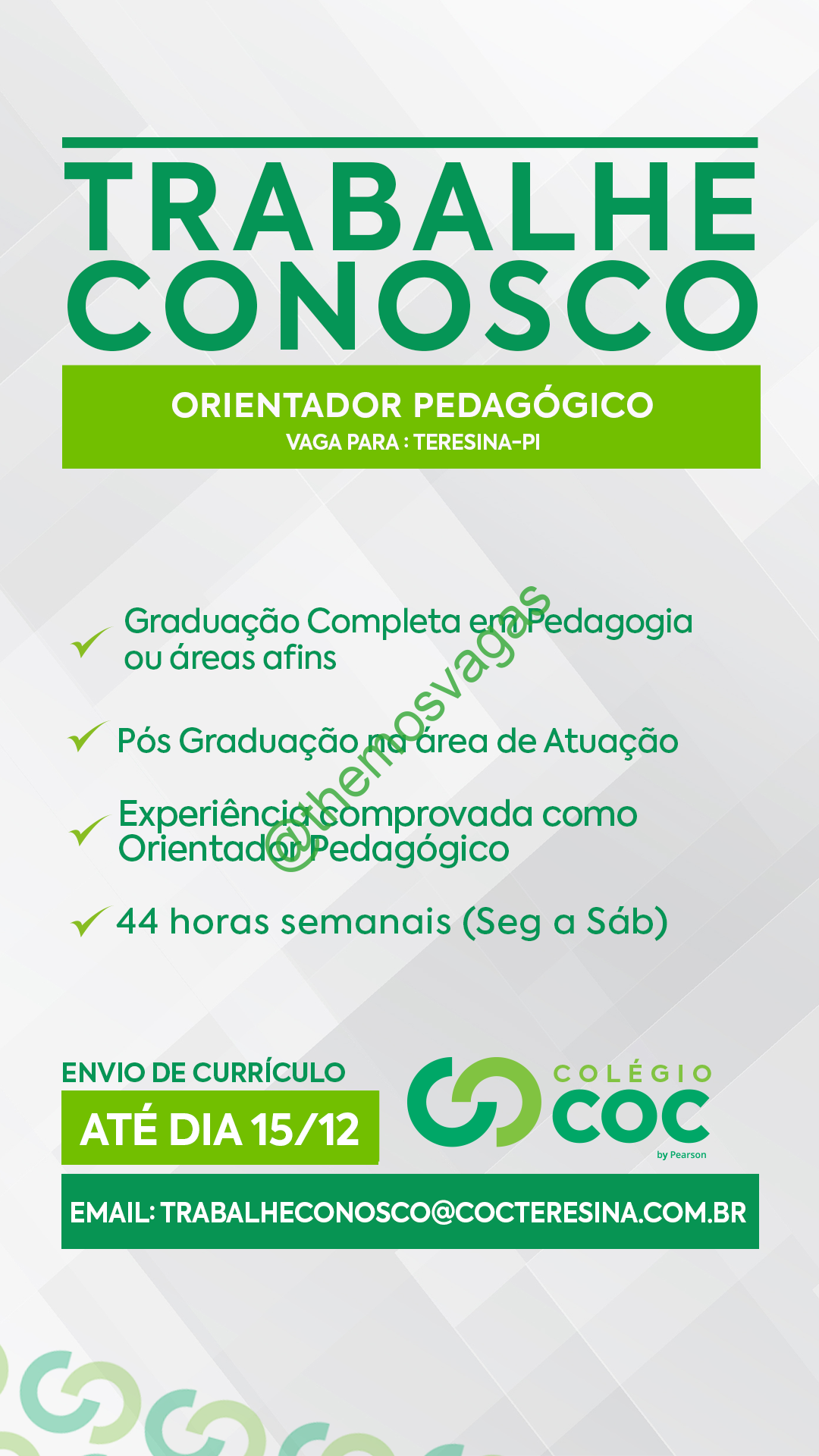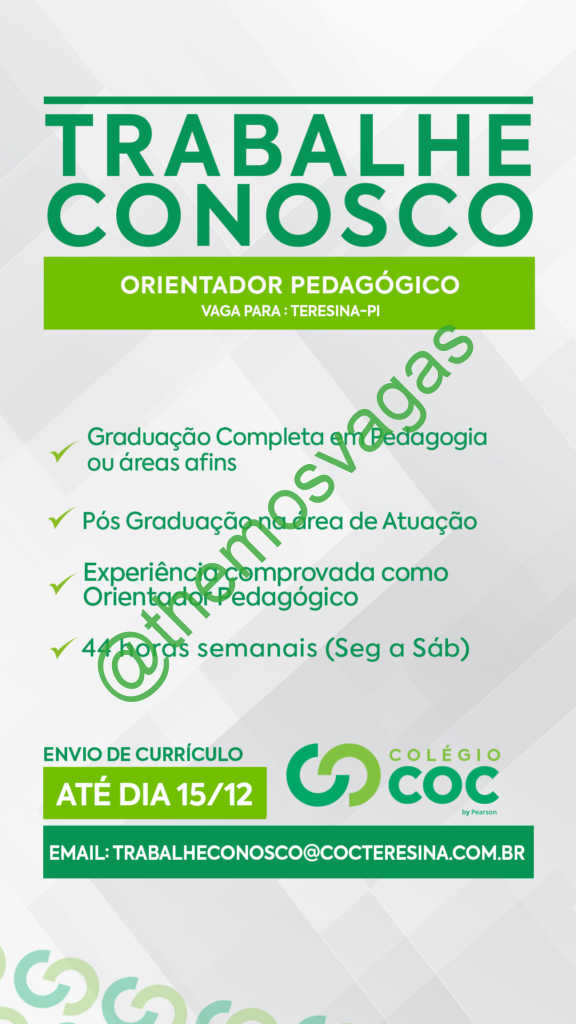 – Interessados(as) e que atendam ao perfil solicitado acima, devem enviar o currículo até 15/12/2019 para o e-mail trabalheconosco@cocteresina.com.br contendo no título/assunto “Orientador Pedagógico THE