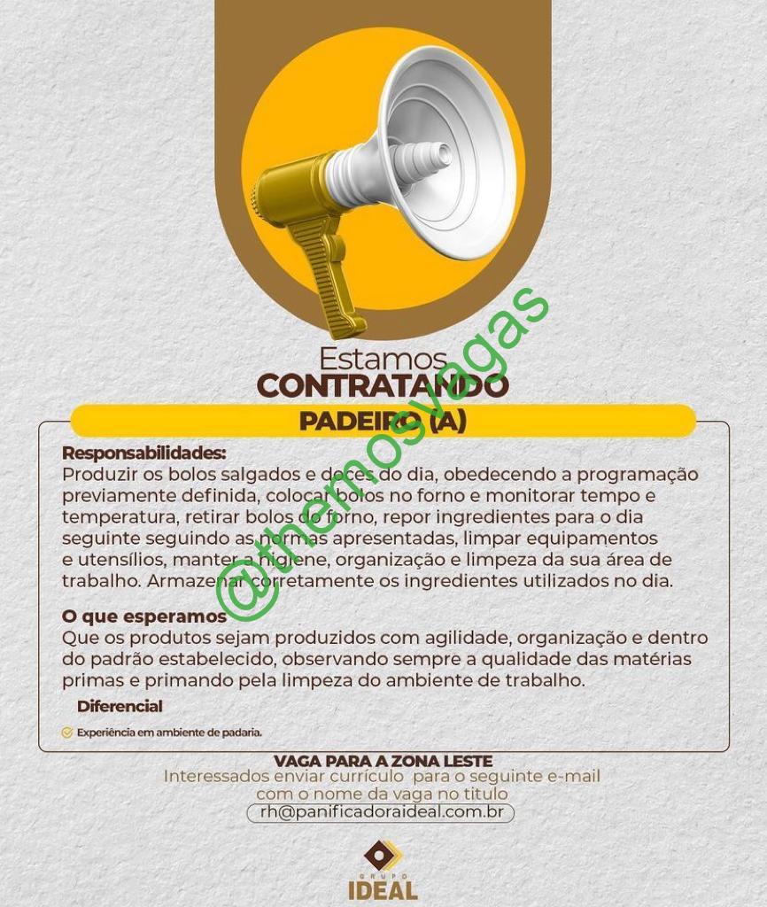 – Interessados(as) e que atendam ao perfil solicitado acima, devem enviar o currículo para o e-mail rh@panificadoraideal.com.br contendo no título/assunto “Padeiro(a) – THE“.