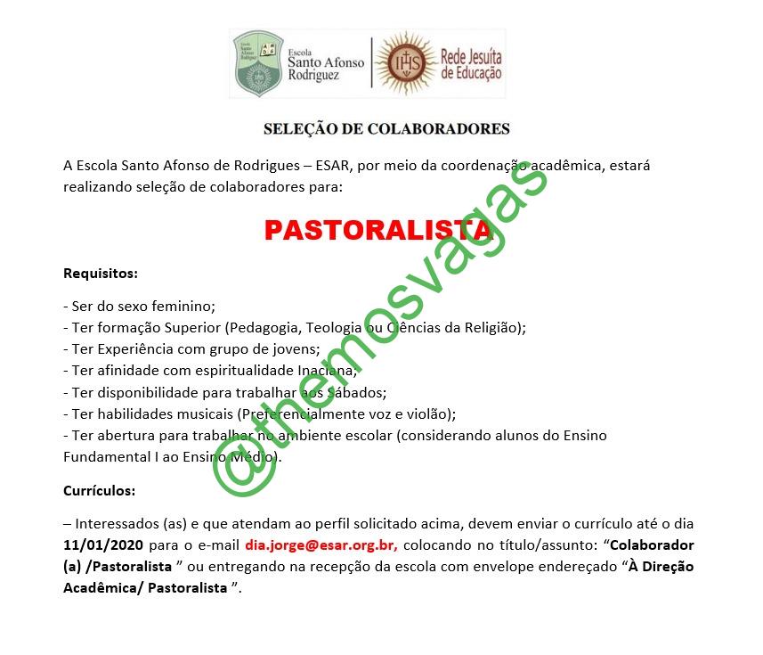 – Interessados(as) e que atendam ao perfil solicitado acima, devem enviar o currículo até 11/01/2020 para o e-mail dia.jorge@esar.org.br contendo no título/assunto “Colaborador(a)/Pastoralista” ou entregar na recepção da escola com envelope endereçado “À Direção Acadêmica/Pastoralista”.