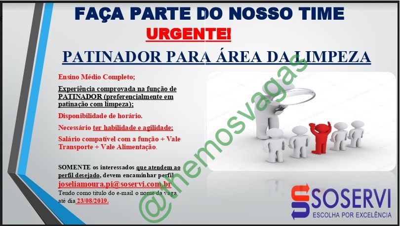 – Interessados(as) e que atendam ao perfil solicitado acima, devem enviar o perfil profissional até 23/08/2019 para o e-mail joseliamoura.pi@soservi.com.br contendo no título/assunto “Patinador THE“.