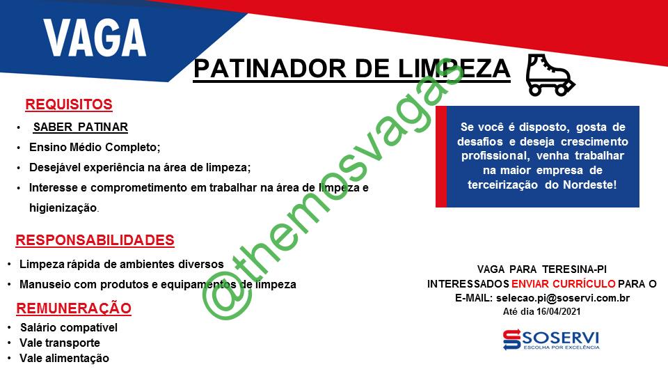 – Interessados(as) e que atendam ao perfil solicitado acima, devem enviar o currículo até 16/04/2021 para o e-mail selecao.pi@soservi.com.br contendo no título/assunto “Patinador de Limpeza THE