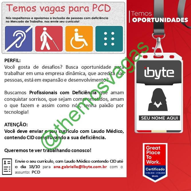 – Interessados(as) e que atendam ao perfil solicitado acima, devem enviar o currículo com laudo médico contendo CID para o e-mail ana.gabrielle@ibyte.com.br até o dia 18/10/2019, colocando no título “PCD”.
