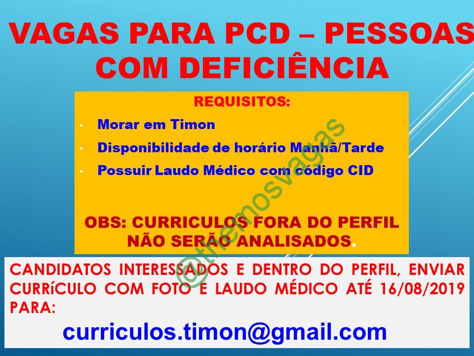 – Interessados(as) e que atendam ao perfil solicitado acima, devem enviar o currículo com laudo médico até 16/08/2019 para o e-mail curriculos.timon@gmail.com contendo no título/assunto “PCD Timon”.