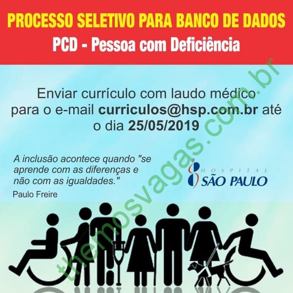 – Interessados(as) e que atendam aos requisitos devem enviar o perfil profissional até o dia 25/05/2019, colocando no título do e-mail “PCD”, para: curriculos@hsp.com.br