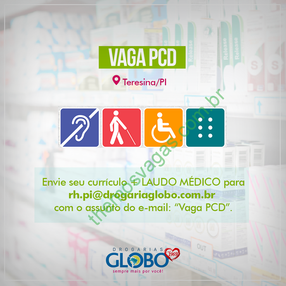 – Interessados(as) e que atendam aos requisitos devem enviar o perfil profissional e laudo médico, colocando no título do e-mail “Vaga PCD”, para: rh.pi@drogariaglobo.com.br