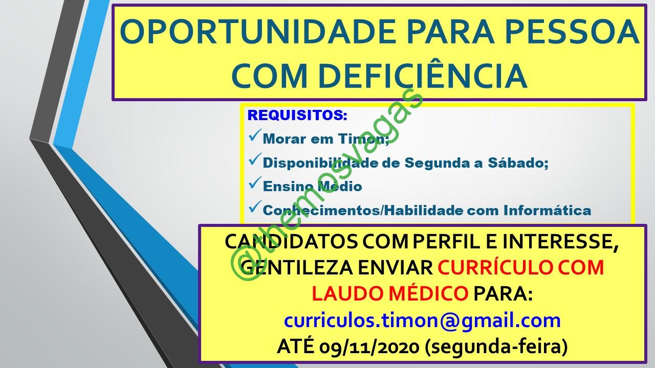 – Interessados(as) e que atendam ao perfil solicitado acima, devem enviar o currículo + laudo médico até 09/11/2020 para o e-mail curriculos.timon@gmail.com contendo no título/assunto “PCD Timon