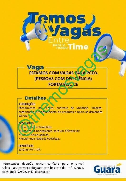 – Interessados(as) e que atendam ao perfil solicitado acima, devem enviar o currículo até 13/01/2021 para o e-mail selecao@supermercadoguara.com.br , contendo no título/assunto “Pessoas com Deficiência – FOR“.