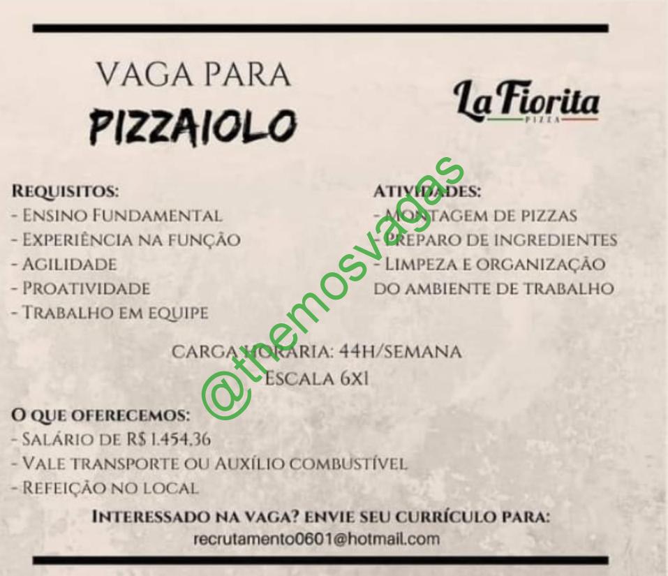 – Interessados(as) e que atendam ao perfil solicitado acima, devem enviar o currículo para o e-mail recrutamento0601@hotmail.com, contendo no titulo/assunto “Pizzaiolo – FOR