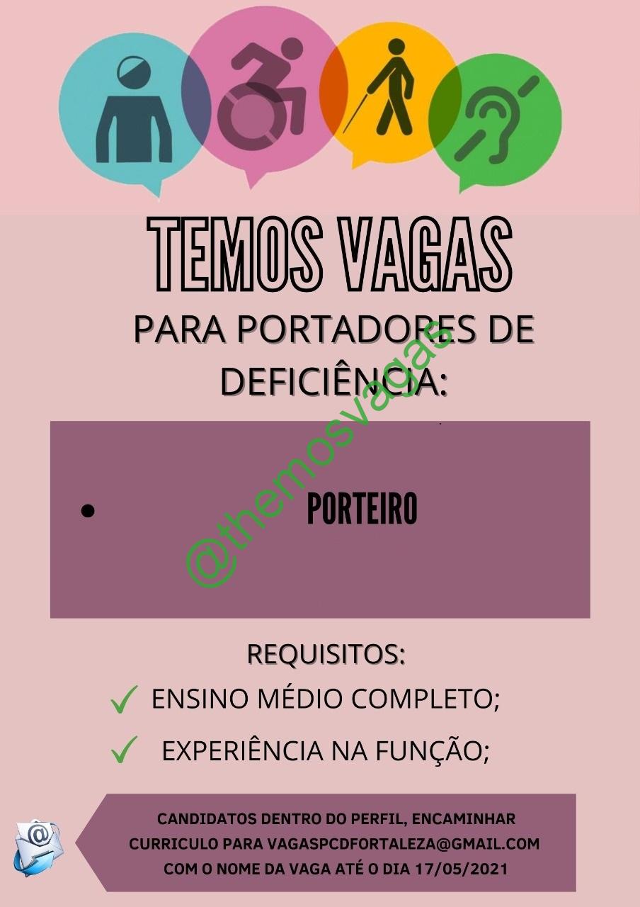 – Interessados(as) e que atendam ao perfil solicitado acima, devem enviar o currículo até 17/05/2021 para o e-mail vagaspcdfortaleza@gmail.com, contendo no título/assunto “Porteiro – FOR“.