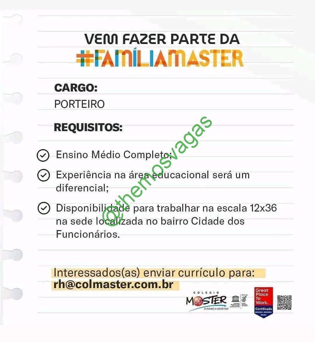 – Interessados(as) e que atendam ao perfil solicitado acima, devem enviar o currículo para o e-mail rh@colmaster.com.br, contendo no titulo/assunto “Porteiro – FOR