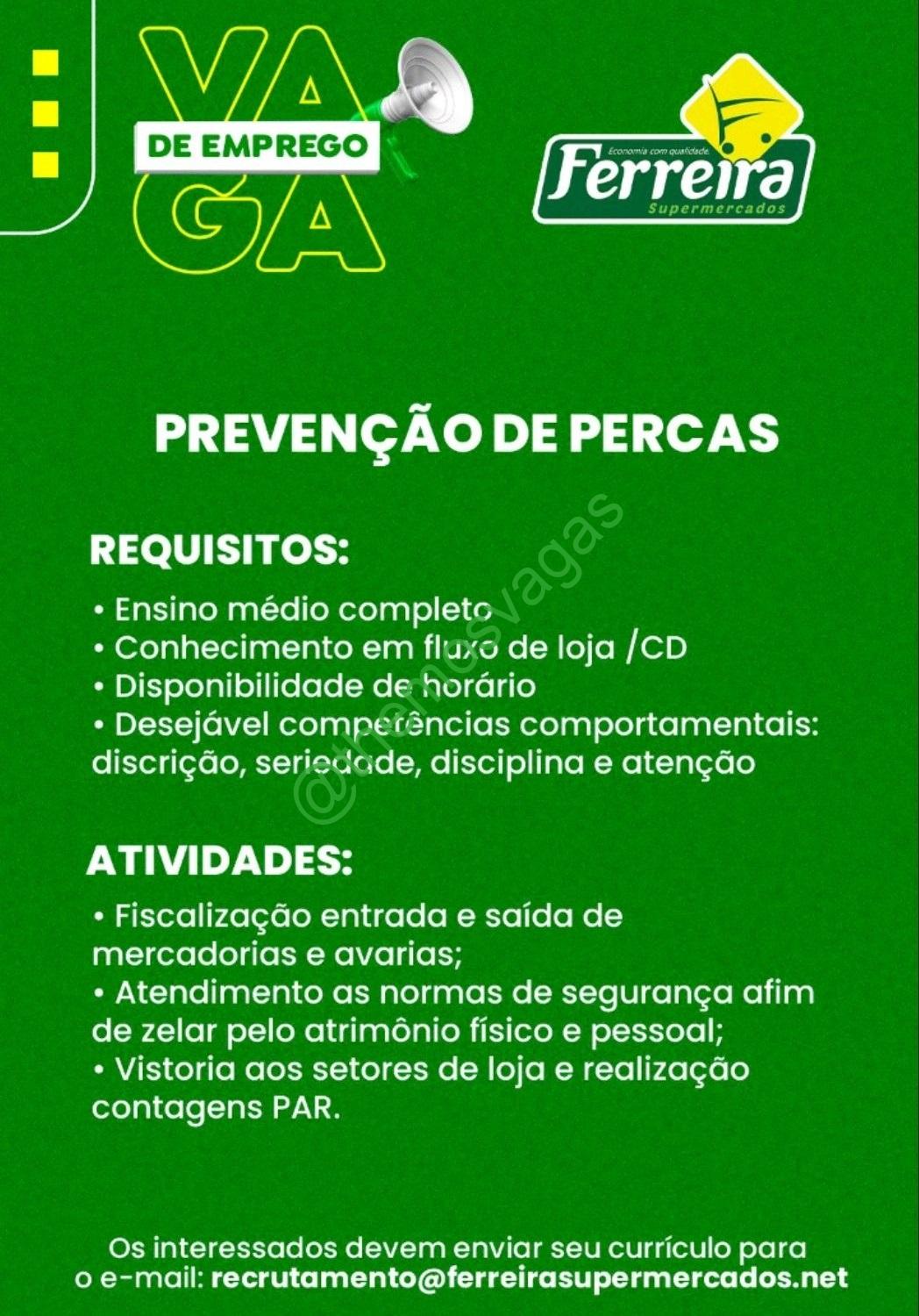 – Interessados(as) e que atendam ao perfil solicitado acima, devem enviar o currículo para o e-mail recrutamento@ferreirasupermercados.net contendo no título/assunto “Prevenção de Perdas – THE“.