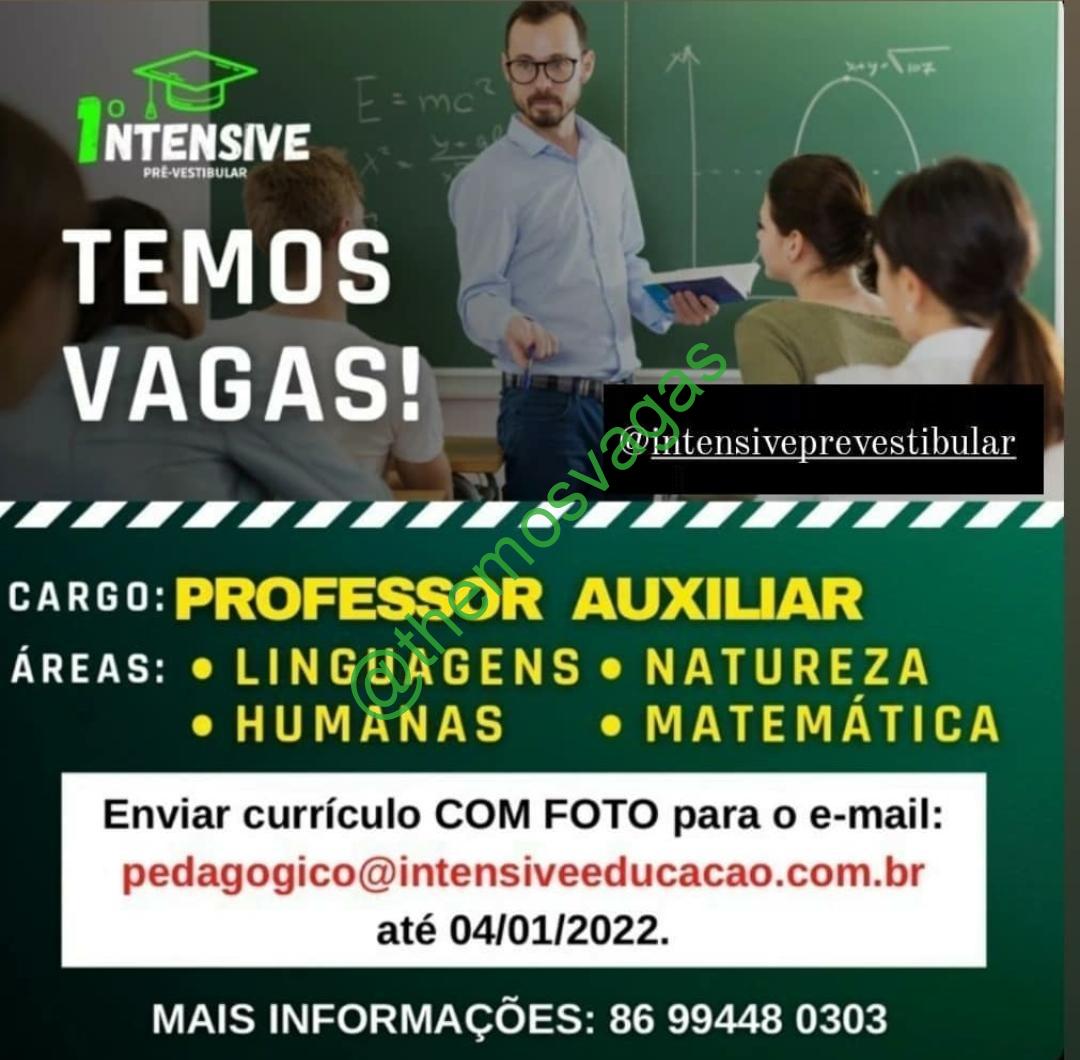 – Interessados(as) e que atendam ao perfil solicitado acima, devem enviar o currículo com foto até 04/01/2022 para o e-mail pedagogico@intensiveeducacao.com.br, contendo no título/assunto “Professor Auxiliar (Nome da área) – PHB“.