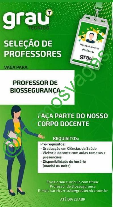 – Interessados(as) e que atendam ao perfil solicitado acima, devem enviar o currículo para o e-mail cariricurriculo@grautecnico.com.br, contendo no título/assunto “Professor de Biosegurança – FOR”.